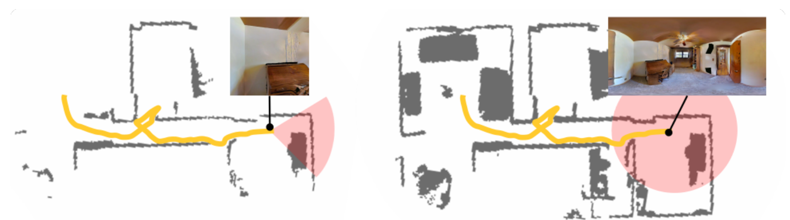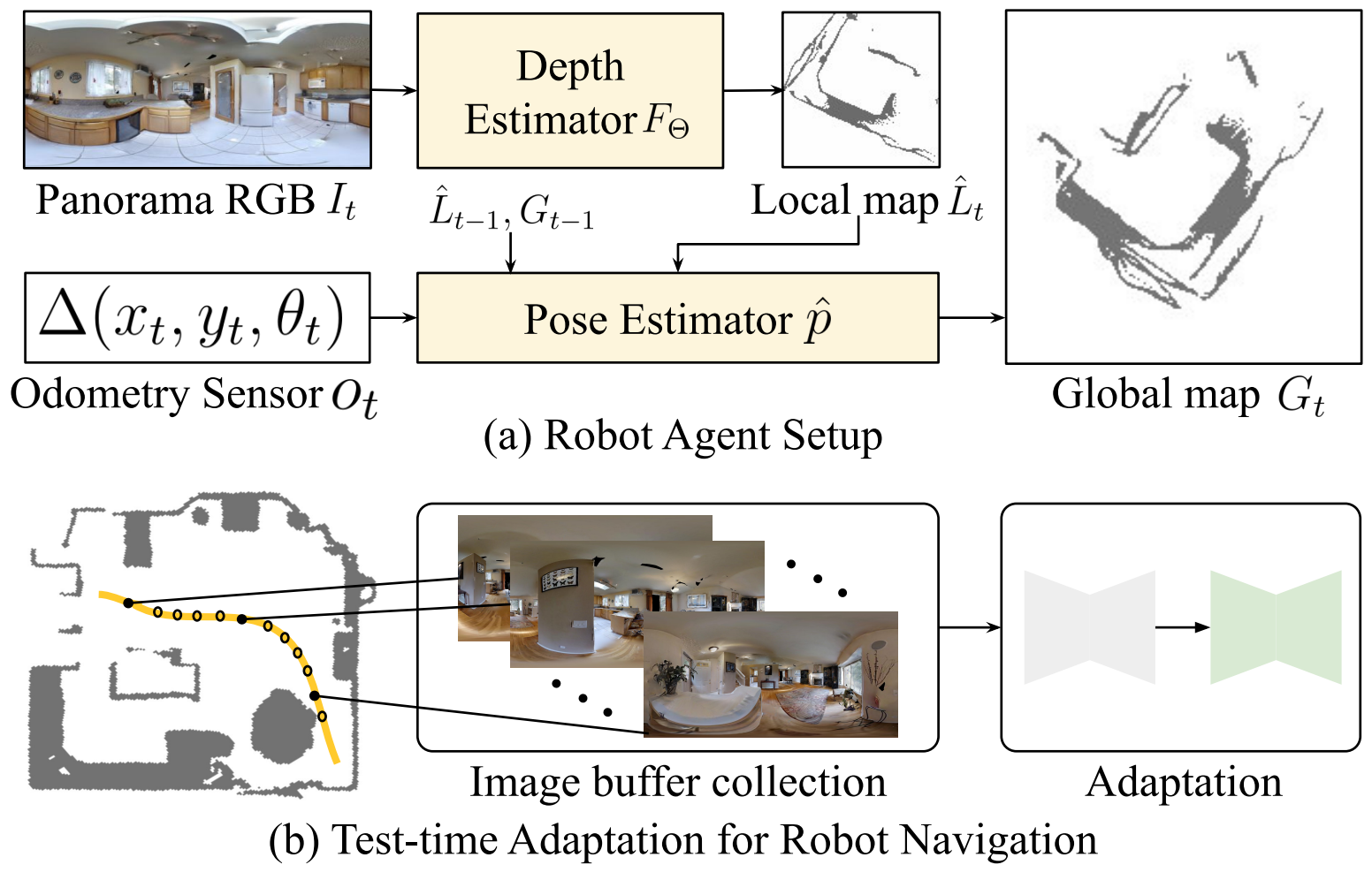 We test our adaptation algorithm on visual navigation, where we consider a robot agent equipped with a 360-degree camera and a noisy IMU. The agent creates local grid maps from depth estimations, and fuses them to a global map using IMU measurements. During navigation, the agent regularly caches panoramic images, which are further used for online adaptation.