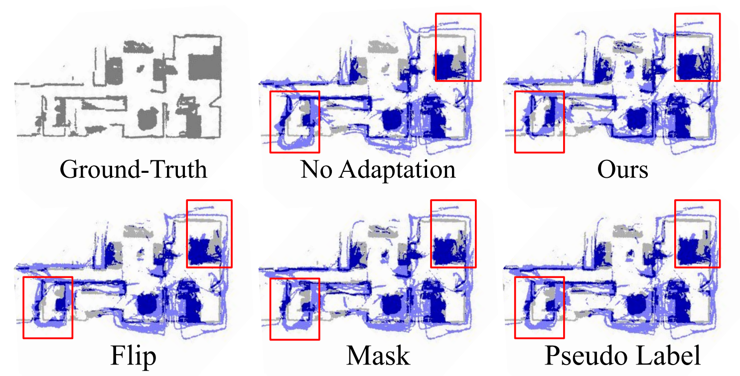 Using our online adaptation scheme, we can improve the quality of grid maps used for visual navigation. While initial depth estimates in new, unseen environments are quite noisy without adaptation, our method enables robot agents to build more accurate maps without large amounts of labeled data.