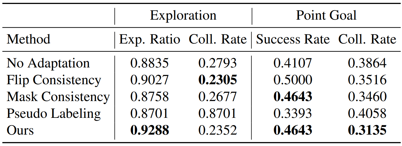 Quantitatively, our online adaptation scheme leads to enhanced exploration and point-goal navigation performance.